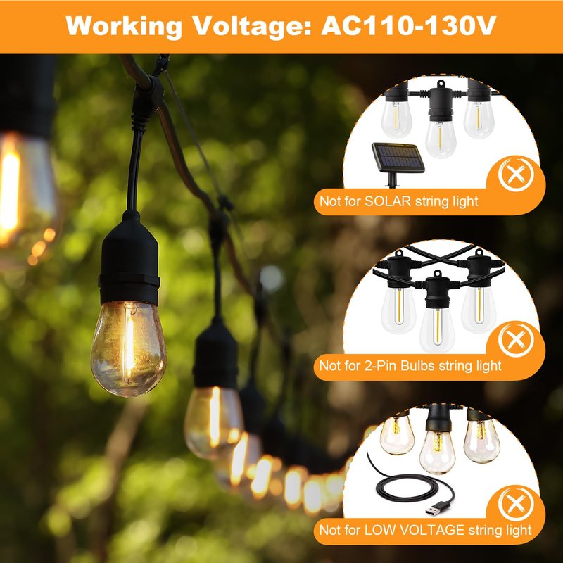 - ⚠️ Warm Tips: WORKING VOLTAGE: 110V-130V, these S14 light bulbs can't work with SOLAR STRING LIGHT and other string lights which are ONLY DC 3V or 6V LOW VOLTAGE.