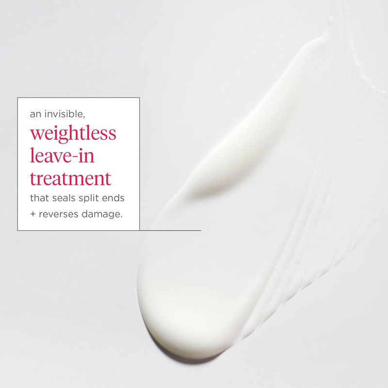 A lightweight leave-in treatment scientifically proven to visibly seal up to 100% of split ends after two uses. This clinically-tested leave-in treatment visibly seals up to 100% of split ends after two uses. Infused with biomimetic lipids, this easy-to-use leave-in treatment strengthens and repairs dry, damaged hair with no downtime. 97% naturally-derived, vegan + Leaping Bunny certified cruelty-free. Good for dry, brittle, damaged hair of all types and textures. Visibly seals up to 100% of split ends after two uses. Scientifically proven to prevent hair breakage. Scientifically proven to boost hair moisture by up to 5X after two uses. Apply to damp hair, focusing on mid-lengths to ends. Comb through to ensure even application. Do not rinse. Style as normal. Intense moisture in a lightweight milk feels like Soft, lightweight milk smells like Clean soap wrapped in floral white musk with a woody finish. dries down A clear, clean, weightless finish. Algae extract provides minerals, amino acids, antioxidants, and vitamins to nourish and strengthen hair and protect the scalp from free radical damage. Argan, coconut + rosehip oil provide essential fatty acids to balance hair moisture. Naturally derived repair copolymer bonds and seals the lifted and damaged hair cuticle. Ceramides are biomimetic lipids that strengthen and reinforce the hair cuticle.