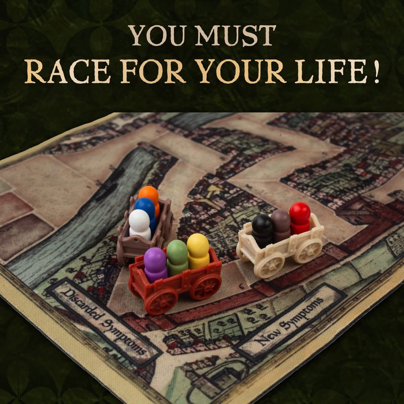 - GAMEPLAY: Begin in 1 of 3 carts & try to be the first out of town. If anyone on your cart has the plague when you finish, you die! Play until an all-healthy cart crosses or everyone has the plague.
