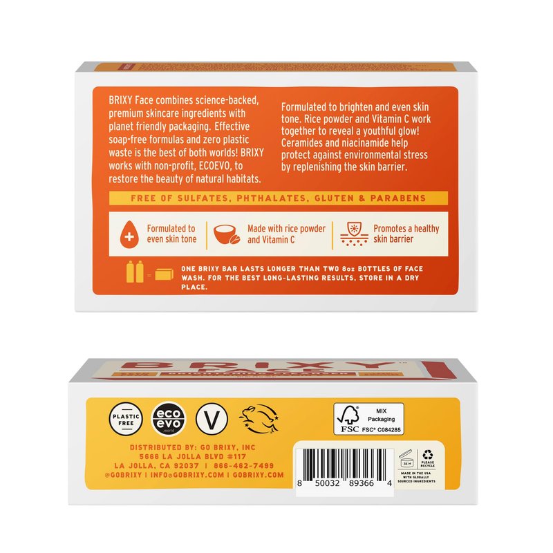 A facial care routine that will make you forget about your old liquid cleansers in plastic bottles! BRIXY bars are made for skin care enthusiasts seeking plastic-free alternatives. This Exfoliating Facial Cleansing Bar for more even skin tone is formulated with rice powder and vitamin C to to gently exfoliate while brightening and evneing skin tone for a youthful glow! The BRIXY Blend - a ceramide and niacinamide complex supports a healthy skin barrier to protect against environmental stress and seal in moisture. For all skin types including sensitive, melanated, mature or teenage skin. Free from soap, sulfates, phthalates, parabens. 100% natural scents as well as vegan and certified cruelty-free by Leaping Bunny. One bar replaces two 8 ounce plastic bottles of water-based fash wash.