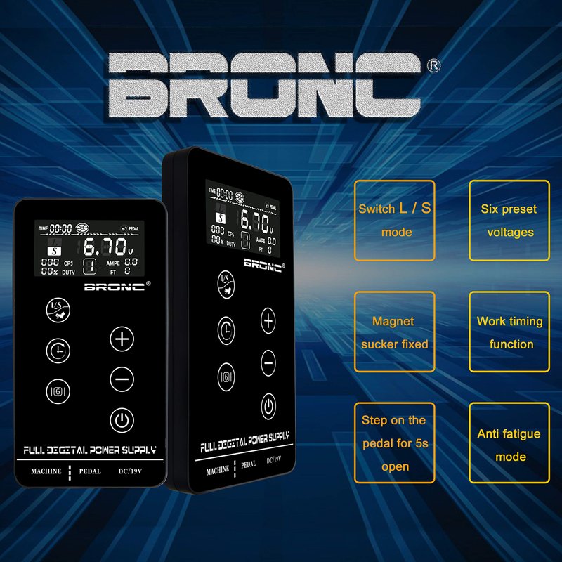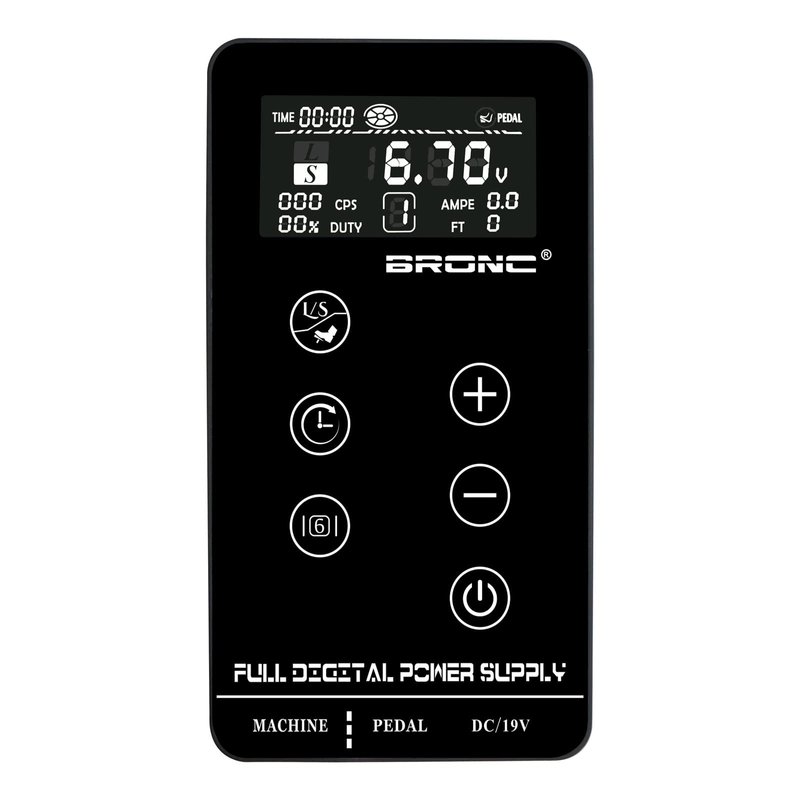 Package Includes: 1 Tattoo Power Supply 1 Power Cord 1 Set of Holder Parts Features: Model: BRONC Tattoo Power Supply TPN-035 Display: LCD Digital Input voltage: 90V-240V, AC50/60Hz. Output Voltage: 3~18v Output Power: 0.3-68W Output Current: 0-3A, accuracy ± 0.1 A. Output current overload protection. Operating Temperature: 5 ~ +45 ℃ Relative humidity 30%~75%. Operating Air Pressure: 900-1060 HPA Instructions for BRONC Tattoo Power Supply TPN-035: [Switch ON/OFF and START/STOP functions]: 1.When plugged into the power supply, press “POWER BUTTON" for 1 seconds to switch on, or another 3 seconds to switch off. 2.5 seconds press on foot pedal to switch on, when switch on, touch "POWER BUTTON"" to start/stop the power. [Adjust the output voltage]: when switched on, touch "VOLTS+" "VOLTS-" to adjust the voltage output [L/S & Foot Pedal Moodle]: 1.When switched on, touch "L/S BUTTON" switch to L/S model, when switch to L model, L be lighted, switch to model S will be lighted. 2.when switched on, press "L/S BUTTON" for 3 seconds to change the foot pedal model. 3.This machine offer two kinds of foot pedal mood, one is continuous output mood, another is inching output mood. The Tattoo Power Supply manual includes all operating ways.