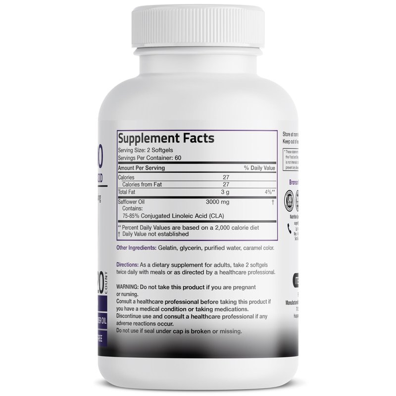 CLA is produced from Linoleic Acid (LA), which is part of a family of isomers found in CLA. CLA fatty acids are also known as CLA isomers. CLA is primarily found in select meats, dairy products, and other food items. And, since the body does not produce this fatty acid, it must be obtained through the diet or supplementation. Studies have shown that when dietary amounts of CLA are increased, CLA levels in body tissues increase, which can help maintain lean body mass. Bronson’s CLA 3000 provides active CLA from safflower seed oil. In addition to being effective, research has also shown CLA to be safe when used as directed. Bronson’s CLA delivers 3000 mg. of pure safflower seed oil, providing 75-85% active CLA per serving. That’s a minimum of 4500 mg. of CLA from a four-capsule daily serving. For best results, take two softgels two times daily with meals as part of a healthy diet and lifestyle. CLA 3000 does not contain any central nervous system stimulants. Non-GMO. These statements have not been evaluated by the Food and Drug Administration. This product is not intended to diagnose, treat, cure or prevent any disease.