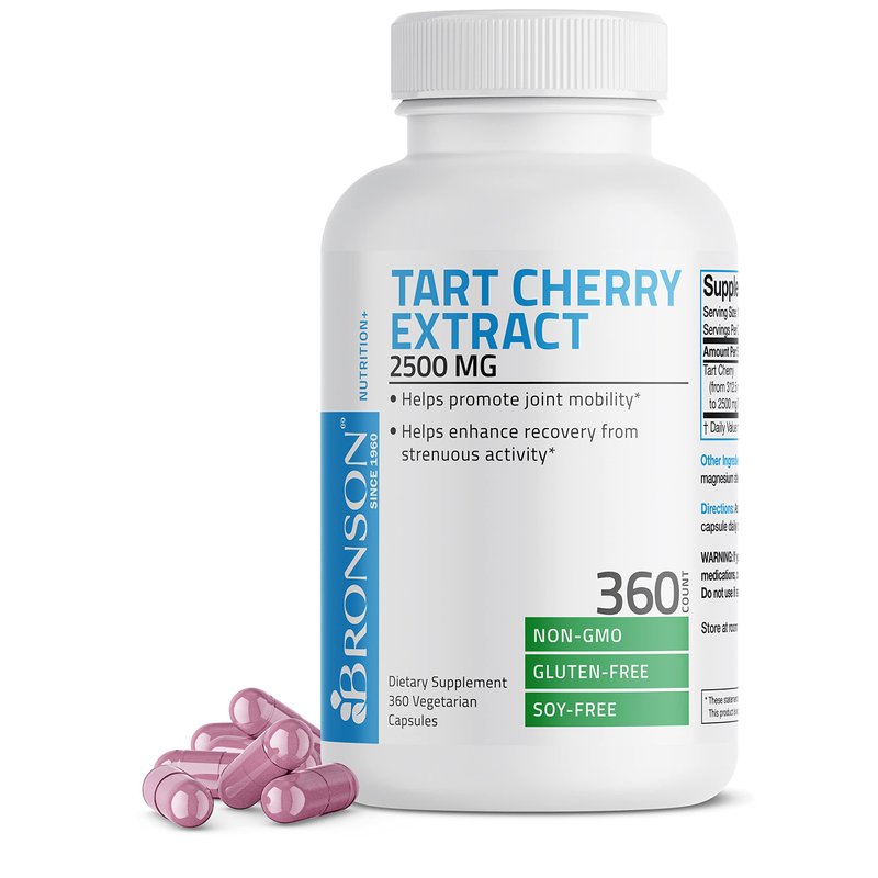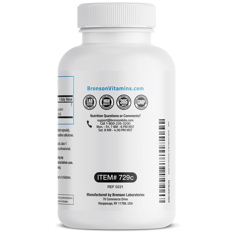 Bronson Tart Cherry 2500 mg. is a vegetarian supplement that features an 8:1 ratio of concentrated tart cherry anthocyanin extract, which is equivalent to 2500 mg. of whole tart cherry fruit. And, Bronson’s Tart Cherry provides all the benefits of tart cherries without the calories or added sweeteners often found in cherry juice.