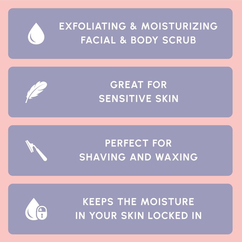 - EXFOLIATING & MOISTURIZING FACIAL & BODY SCRUB: Our Brown Sugar Body Scrub and Face Scrub is a gentle sugar scrub that can be used as a Facial Scrub, Body Scrub, and Foot Scrub. It is a triple action body and face exfoliator and moisturizer. Containing only pure and natural ingredients, it acts as a natural exfoliator removing dead skin, and moisturizing to reveal fresher healthier clear skin.