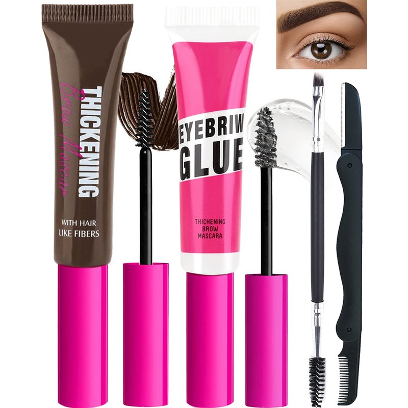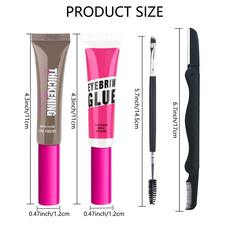 - THICKENING BROW GEL KIT - You will get 1Pcs thickening eyebrow gel,1Pcs clear setting brow gel,1 brow razor and 1 eyebrow brush. The thickening brow gel contains high-quality man-made fiber, thicken and stereotype all types of eyebrows with a natural finish that lasts up to 16 hours with this set brow mascara in 8 high-impact inclusive shades.