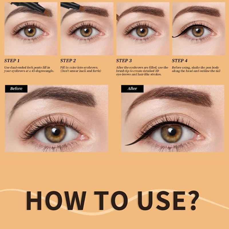 - Magical Dual-Headed Eyebrow Pencil:Our 2-in-1 dual-headed eyebrow pencil comes with two different pen tips. They are very soft and glide smoothly. One end has a fine-tip applicator for easy and accurate application. It can accurately shape the eyebrows you want like a brush stroke, and can also draw eye Wire. The other end has a 4-pronged tip, which is perfect for filling in those sparse areas on your eyebrows, making your eyebrows look full and natural, and achieving fine, hair-like strokes