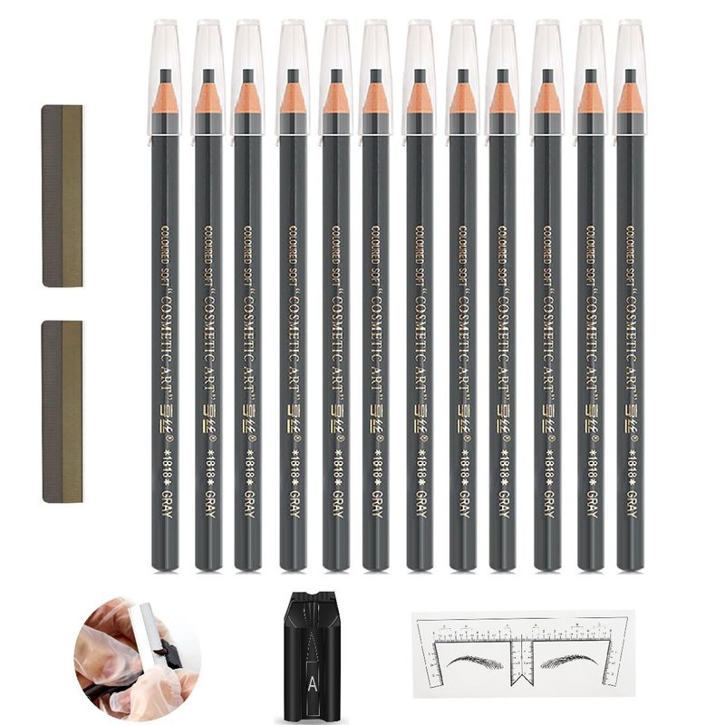 Brow Pencil Mapping Kit 12pcs Microblading Eyebrows Pencil 1pc Permanent Makeup Eyebrow Pencil Duckbill Sharpener 2pcs Razors 10pcs Eyebrow Mapping Stickers (Grey Pencil)