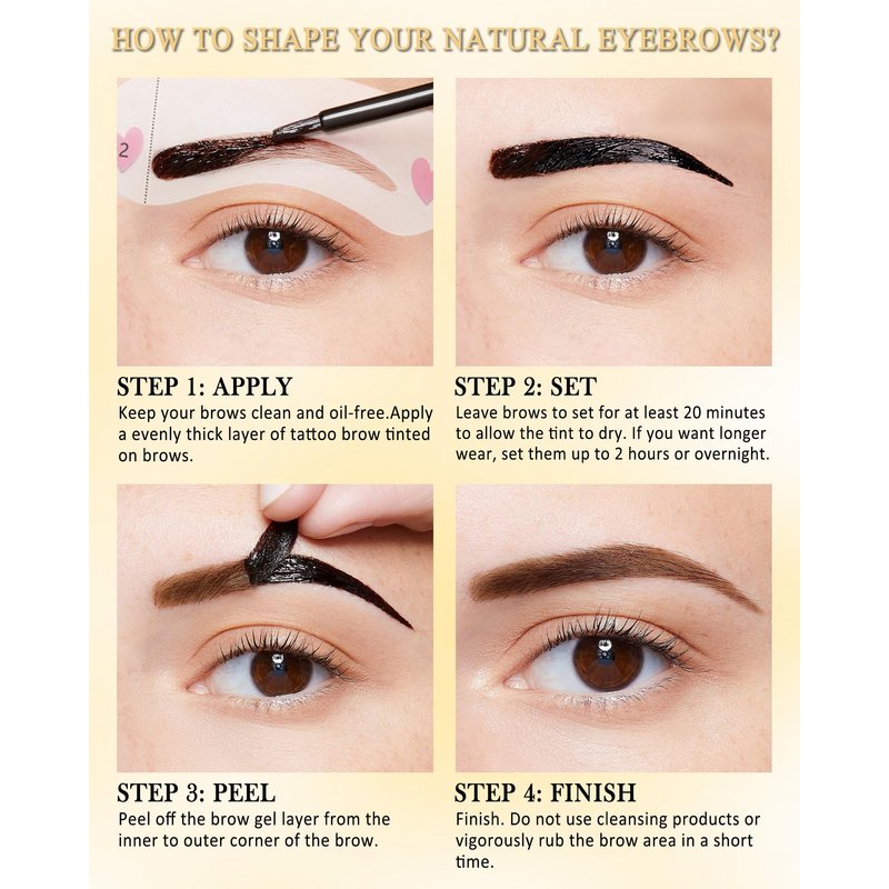 - Easy To Apply & Peel - Come with applicator brushes and eyebrow stencils that make application simple and easy. Just apply the tinted gel evenly on your eyebrows, wait for it to dry for at least 20 minutes, and then gently peel off. (TIPS: Before use: Keep your eyebrows clean and oil-free. After use: Do not use cleansing products or vigorously rub the brow area for 24 hours. If you want longer-lasting results, wear it for up to 2 hours or overnight before peeling it off.)
