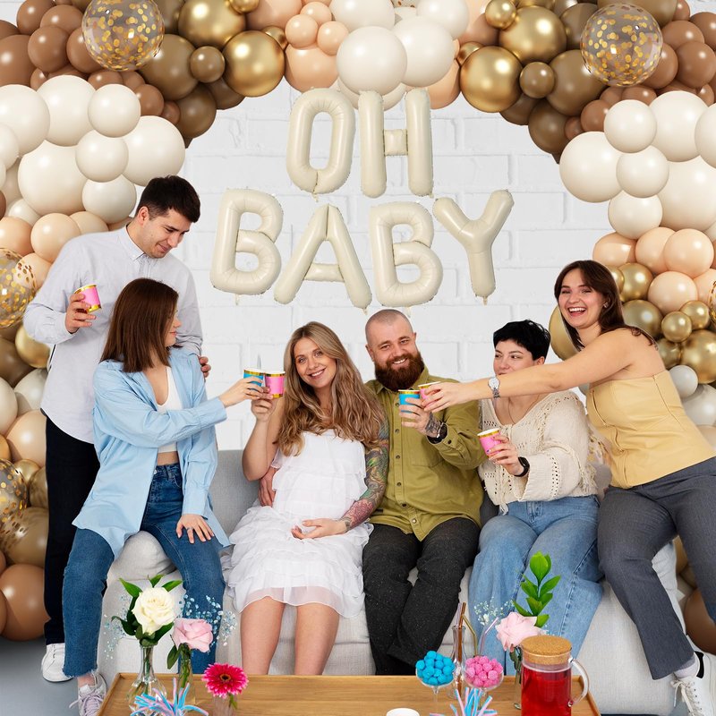 - Package Included: 20pcs nude balloons balloons(5+10"),20pcs sand white balloons balloons(5+10"),23pcs brown balloons balloons(5+10+12"),23pcs cocoa balloons balloons(5+10+12"),10pcs metallic gold balloons(5+10"),5pcs confetti gold balloons,1pcs 16 Inch beige OH BABY balloon banner,glue points,balloon strip tape,ribbon.