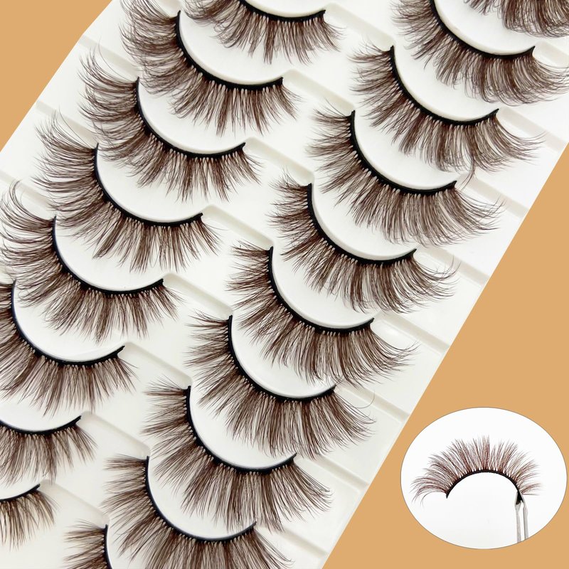 - [ 10 PAIRS BROWN LAHSES NATURAL LOOK ] : Soft premium qualityimported fiber, ultra-light, reusable, fluffy. These wispy brown lashes dyed with natural dyes are not-allergic and cruelty-free ;