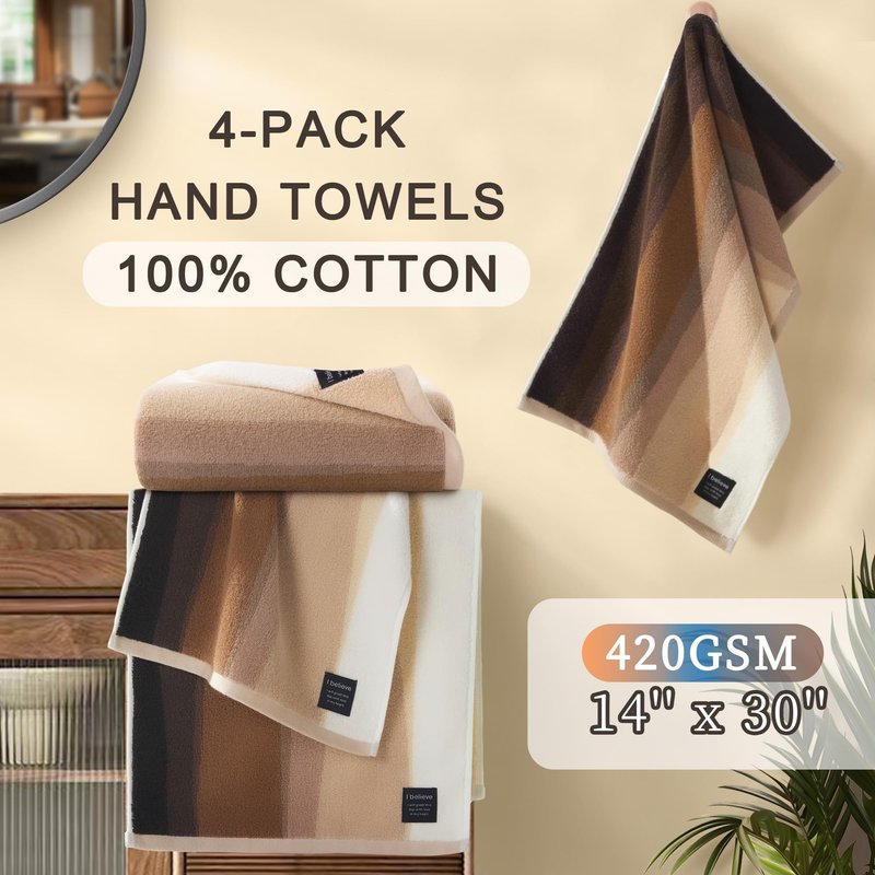 Product Name: Hand Towel 4 PACK Material: 100% Cotton Tone: Brown and Beige Dimensions: 14 inches x 30 inches Package Includes: 4 Hand Towels Bathroom Decor & Daily Use