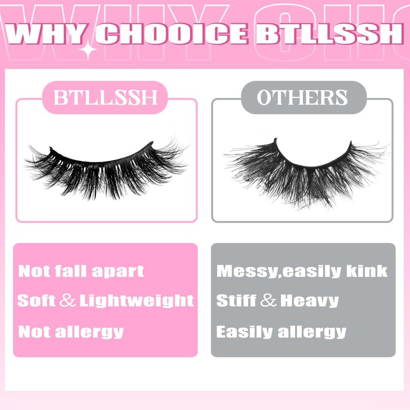 - BTLLSSH FALSE EYELASHES: BTLLSSH 3D natural false eyelashes are made of lightweight faux mink lashes. Contain 8 pairs of natural eye lashes 001A style eyelashes.