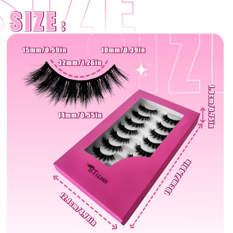 BTLLSSH 8Pair 3D5D 0.55INCH Fluffy Natural Look Faux Mink Lashes Thick False Eyelashes Volume Cat Eye Lashes Extension with Dark Pink Box