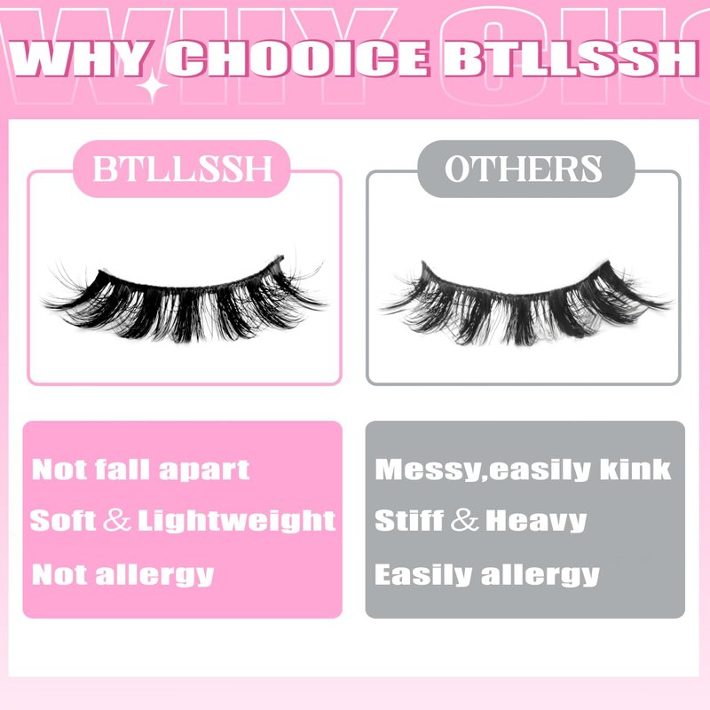 - BTLLSSH FALSE EYELASHES: BTLLSSH 3D natural false eyelashes are made of lightweight faux mink lashes. Contain 8 pairs of natural eye lashes 001A style eyelashes.