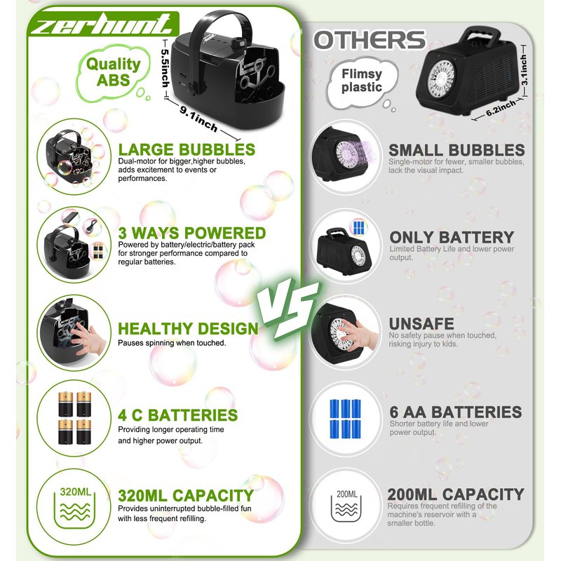Zerhunt Bubble Machine - The Best Partner in Party with Friends & Families Zerhunt bubble machine with high output produces millions of flying bubbles to create a romantic and colorful bubbles dreamland for every user.Especially for your