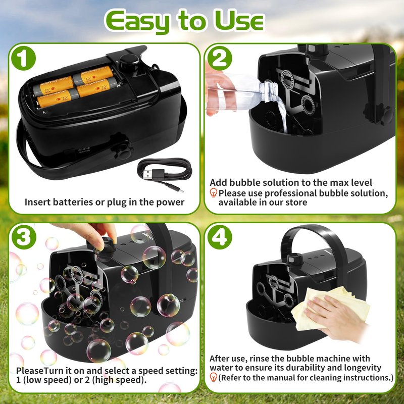 - 【Three-Ways Powered】The Bubble Blower Can Be Powered By 4 Batteries (Not Included) Or Plug In With Adapter(Not Included), Car Charge Or Power Bank, Providing Maximum Convenience For You And Let You Enjoy The Bubble Machine Indoor And Outdoor.
