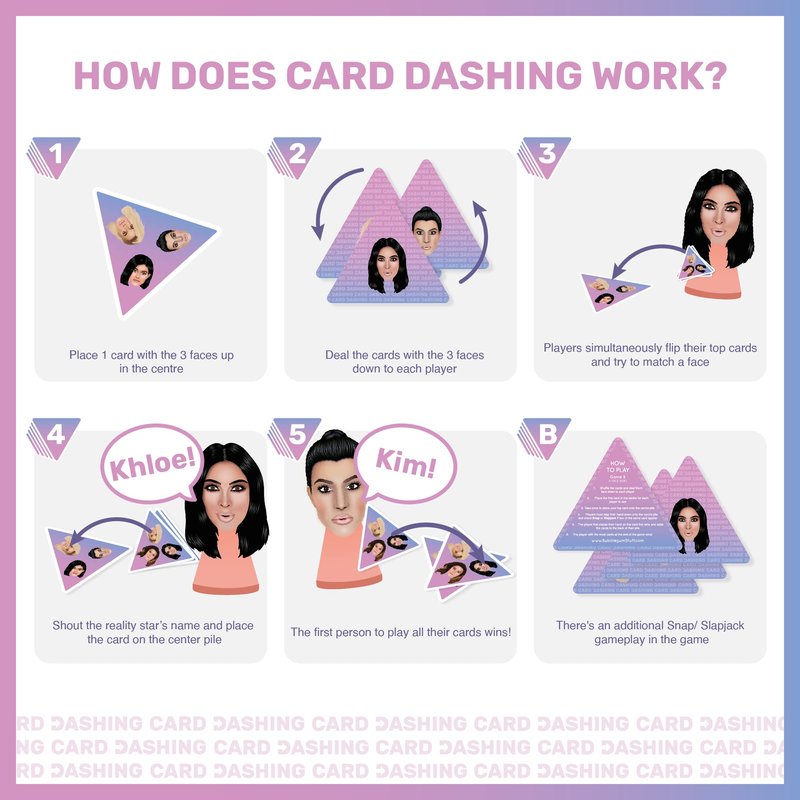 - PUT YOUR REACTIONS TO THE TEST: The classic snap cards are given a Kardashian makeover in this speedy fun snaps game. Your task is to beat your opponents to matching the iconic Kardashian and Jenner faces on the game cards. You can also make keeping up even harder by playing the triple face cards, where you have to match one of the three Kardashian/Jenner faces to the previous card. Warning: You will experience epic levels of frustration when someone beats you to it!