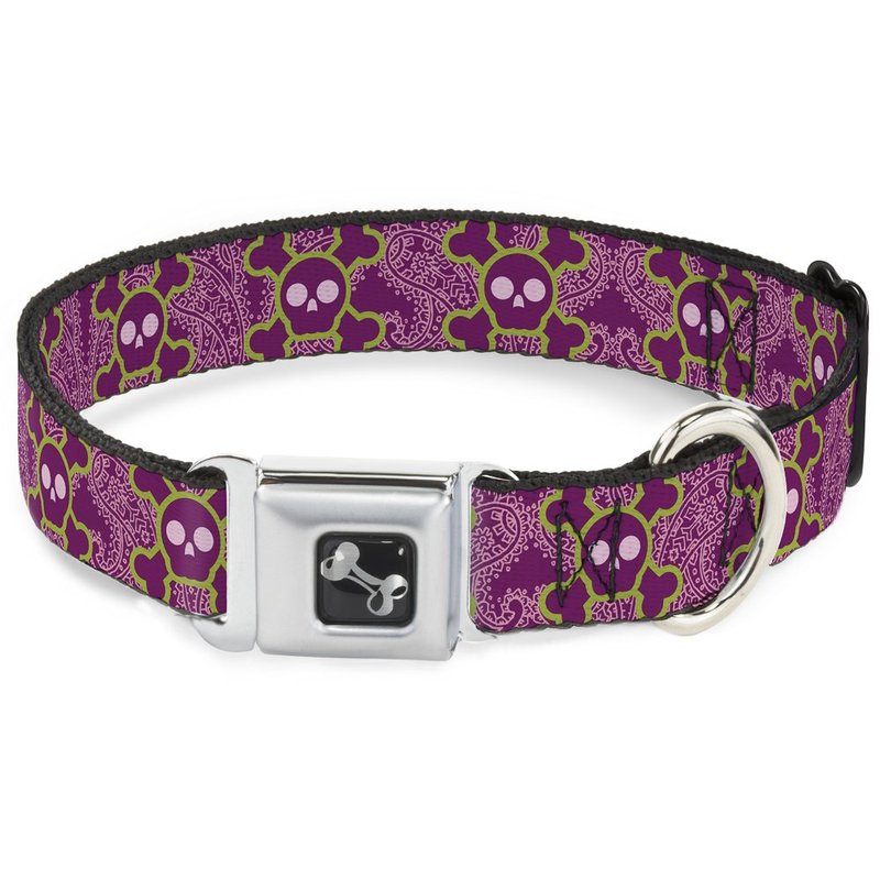 - Style: Buckle-Down Seatbelt Buckle Dog Collar - Cute Skulls w/Paisley Purple/Pink/Green - 1" Wide - Fits 11-17" Neck - Medium