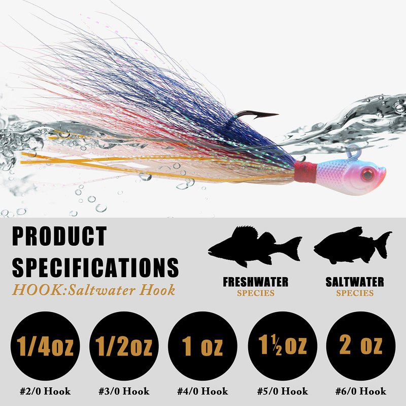 - WEIGHT:5 colors and 5 weights to catch any saltwater species,0.25oz 0.5oz 1oz 1.5oz 2oz (5pcs per pack)
