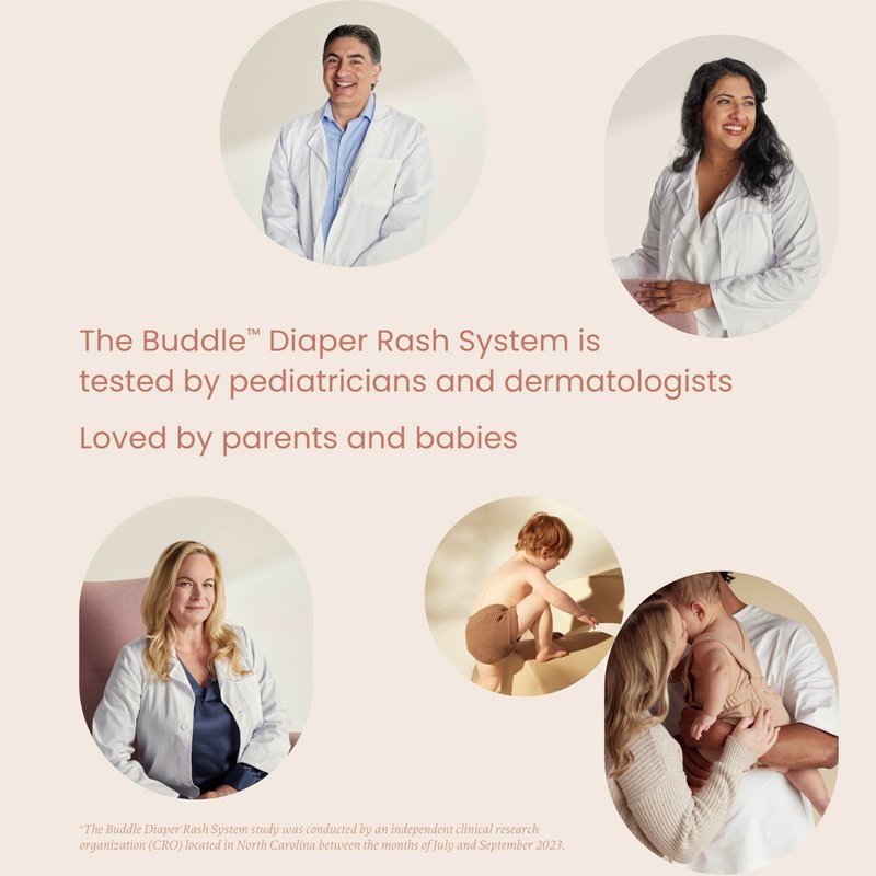Don’t Just Treat Diaper Rash, Prevent It Did you know a newborn’s skin is different than adult skin? It can be up to 10 times more sensitive, 30% thinner, and has reduced moisturizing and skin lipid production — meaning that sweet soft baby skin is more susceptible to irritation. We Took On Diaper Rash So You Don’t Have To Scientific understanding doesn’t just make a difference, it makes all the difference. With a deeper knowledge of infant skin, the diapering environment and the microbiome, we’ve been able to uncover the underlying causes of diaper rash and how to prevent it in three easy steps. Preventing Diaper Rash is as Easy as 1-2-3 As much as we all want one solution, what we found through our research, development, and clinical trial is a system approach yields better outcomes when it comes to the treatment of diaper rash which led to the development of our three product system. Each Buddle product is a diaper bag essential and plays a specific role in the prevention of diaper rash—cleanse, prevent, and treat. Clean Cheeks Foam Cleanser – Remove impurities Bottom Buddy Diaper Cream – Protect & nourish skin barrier Rash Rescue Diaper Rash Healing Paste – Heal with maximum-strength zinc oxide Paddle Pal Diaper Cream Applicator – The perfect companion to apply Bottom Buddy and Rash Rescue.