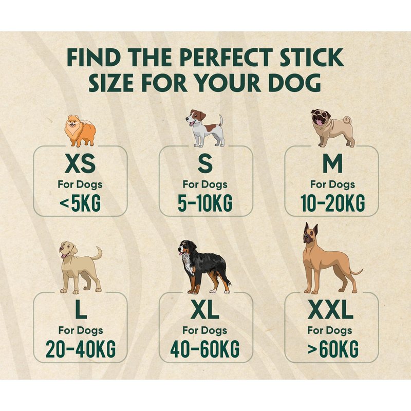 - 6 SIZES: Our coffee wood chewing sticks come in 6 different sizes: XS, S, M, L, XL and XXL. Size XS for Dog (< 5kg), Size S for Dog (5 - 10kg), Size M for Dog (10 - 20kg), Size L for Dog (20-40kg), Size XL for Dog (40-60kg), Size XXL for Dog (>60kg).