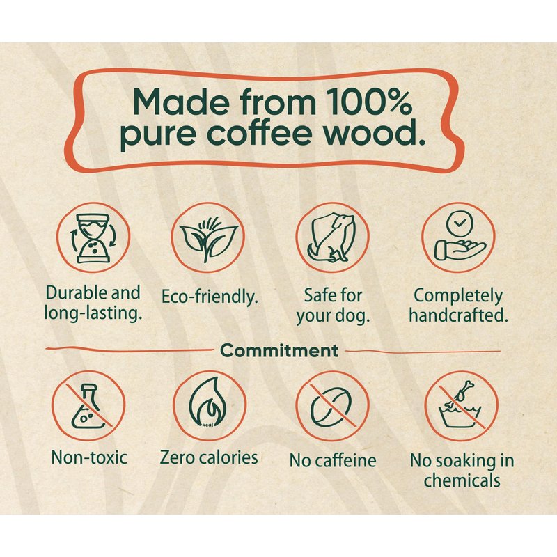 Wooden Chew Stick is made 100% from pure coffee wood grown in the Central Highlands, Vietnam. Its creation involves manual craftsmanship through various stages by experienced artisans. The product possesses high hardness and durability due to being crafted from coffee tree wood aged over 20 years, capable of long-term use. Wooden Chew Stick is entirely safe for your pet dog: Non-toxic - Zero calories - No caffeine - No soaking in chemicals Wooden Chew Stick can bring joy to dogs, reduce stress, minimize object-chewing behaviors, serve as a teeth and gum cleaning tool, prevent oral health issues, and also function as a reward for your beloved pet dog. Each Wooden Chew Stick will have slight differences in shape, color, size, and weight.