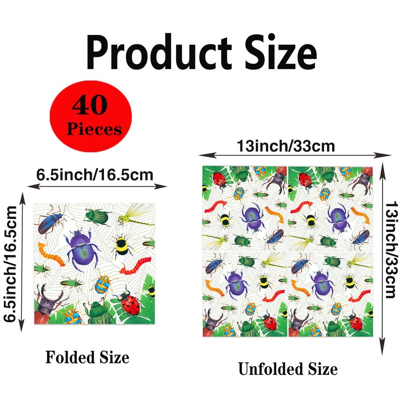 - INCLUDES 40 NAPKINS: This set of bug theme party paper napkins measures 6.5 inches long and 6.5 inches wide when folded and 13 inches long and 13 inches wide when unfolded. Each order includes 40 pre-folded napkins, plenty of quantity to meet your various uses and sharing needs, enough for any occasion at any time.