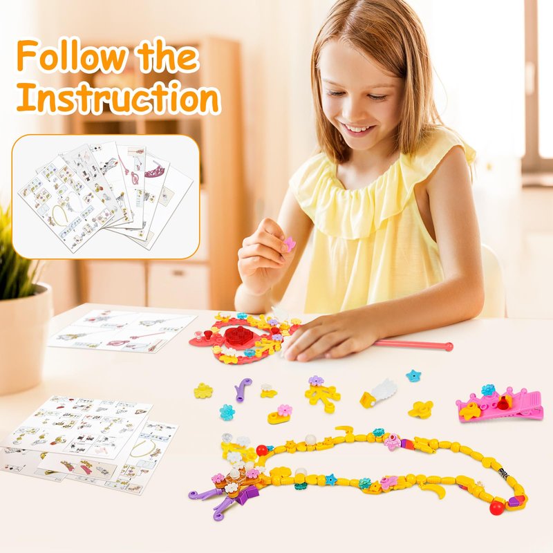 - Instruction Book and DIY】 Each play jewelry project comes with a instruction, step easy to learn, encourage and enhance children's creativity. Kids also can DIY unlimited creative patterns on these accessories and wear them together with family or friends. Jewelry making kit for girls 4-6, adding more fun to their birthday party games. Perfect princess tiara for little girls 3-5.