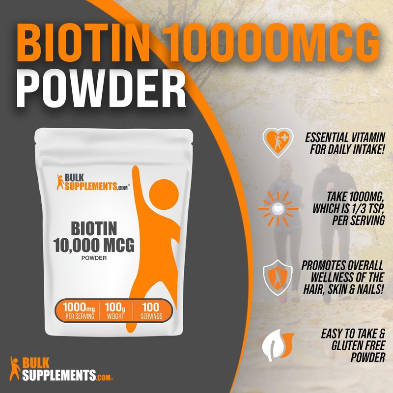 - ✔️Easy to take Vitamin: Always be prepared – no matter where your day takes you. Our Biotin 10000mcg, in easy to take powder, makes it simple for people who likes to take they vitamins for Get the nutrients your body needs with 1/3 tsp, about 1000mg with 10mg of Biotin, of our Biotin supplement!