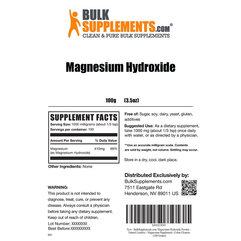BulkSupplements.com Magnesium Hydroxide Powder - Magnesium Supplement, Food Grade Magnesium Hydroxide, Magnesium Hydroxide Supplement - 1000mg (410mg of Magnesium) per Serving, 100g (3.5 oz)