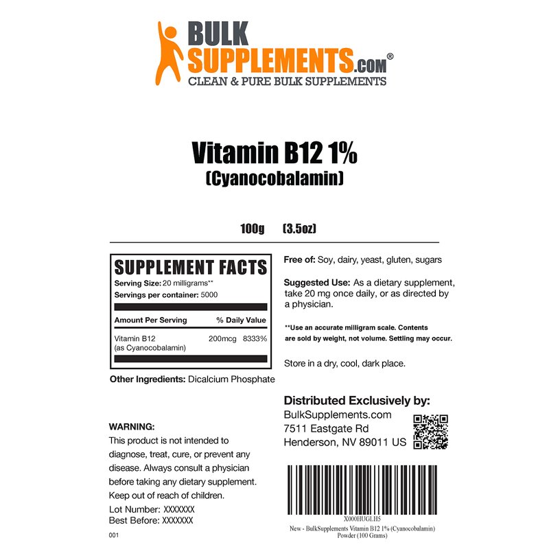 BULKSUPPLEMENTS.COM Vitamin B12 Powder (Cyanocobalamin) - Vitamin B Supplements for Energy Production and Nerve Health - 20 mg (1% Cyanocobalamin) per Serving (100 Grams - 3.5 oz)