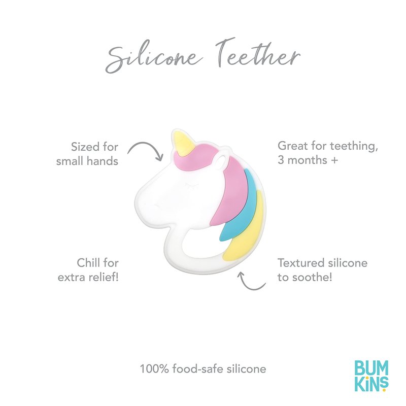 Bumkins Baby Teething Freezer Toy Keys Rings, Soft Flexible Silicone Pacifier, Safe to Chew, Cool Teether Gum Relief, Essentials for Babies 3 Months, Freezable, Sensory Textured, Unicorn