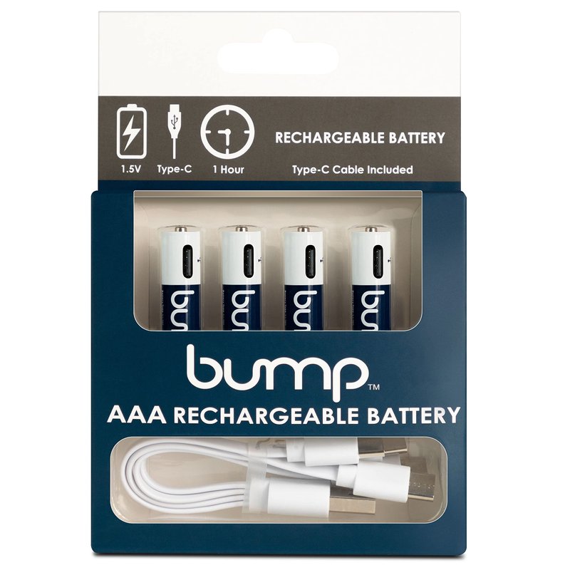 bump AAA 1.5V Rechargeable Batteries, 4-Pack, Lithium Ion, High Output, Fast USB-C Charging, Long Lasting, for Remotes, Toys, Keyboards, Wireless Mice, Includes Charger Cable