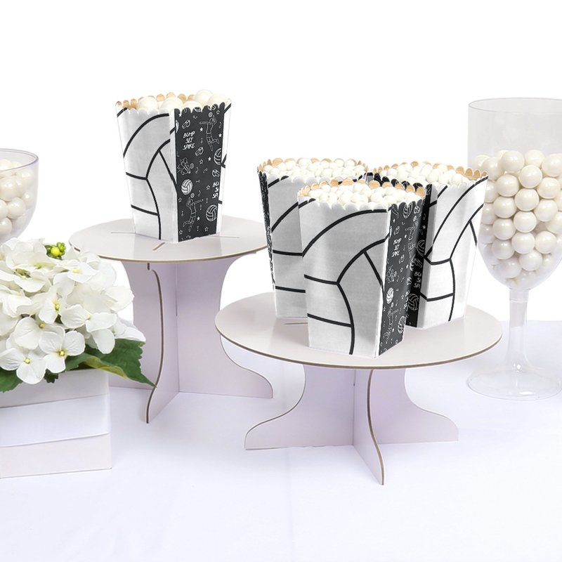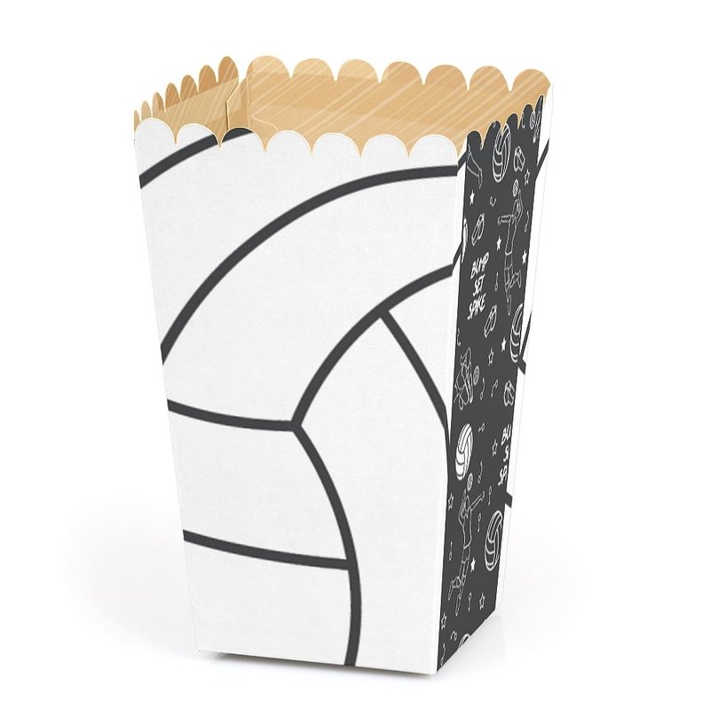 - Volleyball Favor Popcorn Treat Boxes INCLUDES 12 Volleyball party favor boxes. Volleyball treat boxes are perfect for any event. The bump, set, spike theme is great for a baby shower or birthday party.