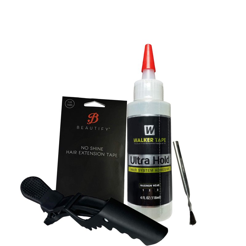Bundle Pack | No Shine Double Sided Tape for Extensions Pre Cut Tabs 120PC/bag and Ultra Hold Hair System Wig Adhesive Nozzle Top 4oz with Small applicator Brush for Wig Glue and Hair Sectioning Clip