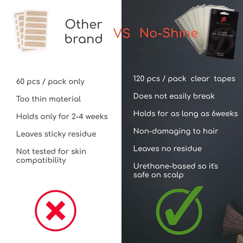 - ✔ EASY TO USE: Double sided tape for expansions tabs are pre-cut, so there’s no stress around having sticky scissors. The liner is white but the genuine extention tape is evident so you're beyond any doubt that the wrap up will be natural-looking! No Shine is known for its adaptability, and quality, making it simple to apply on hair wefts.