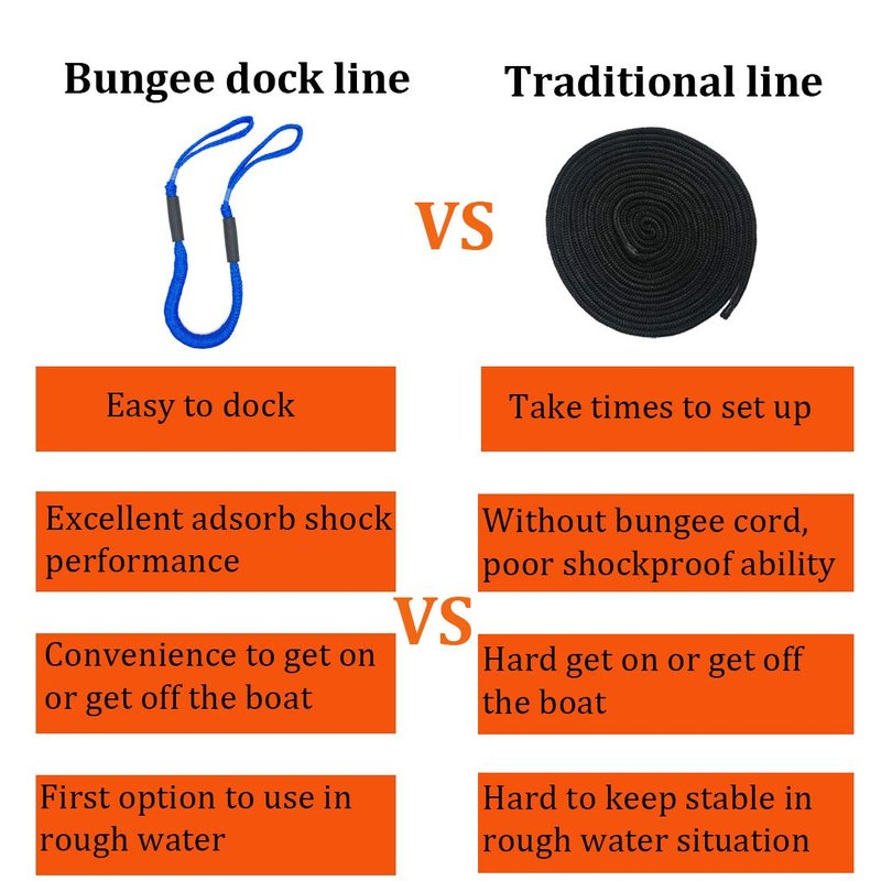 - Bungee Dock Lines-The bungee cord is hidden inside the ropes to act as a built-in snubber,Absorbs the shock to your dock, cleats, pylons, or anchors.