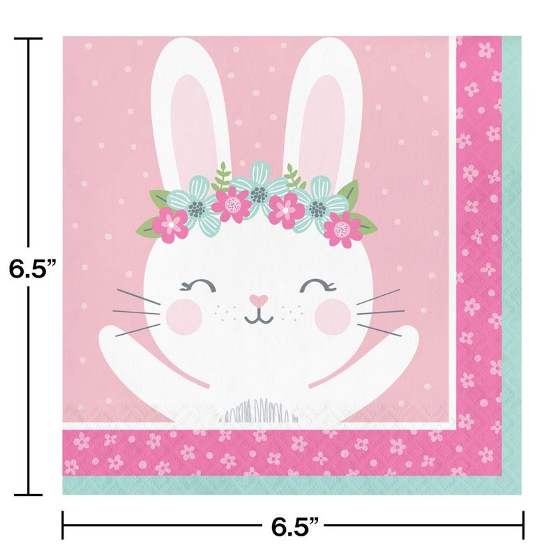 Make your table pretty in pink with the Bunny Party Napkins. These napkins measure 6.5" and features a pink and white color scheme with white polka dots and stars. In the center is a smiling bunny with her arms outstretched and a ring of flowers on her head. Sold in packs of 48, these disposable napkins can be coordinated with our other Bunny Party party supplies.