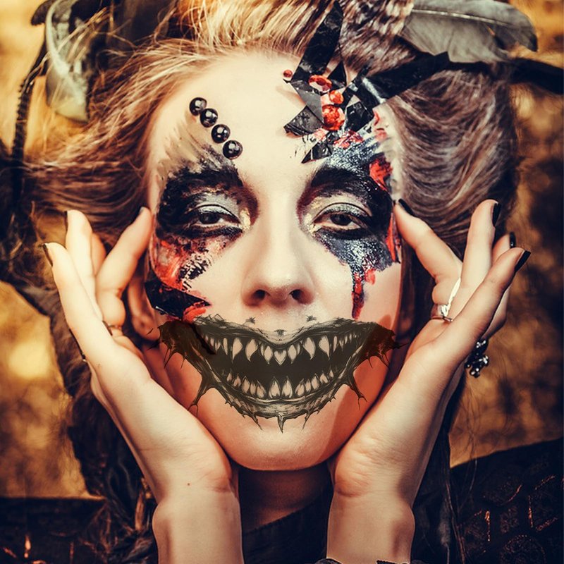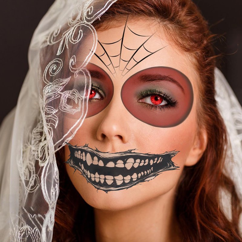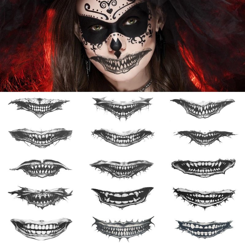 - 【Halloween smile tattoo】 Beautiful and realistic Halloween elements temporary tattoos to create your unique personality. Great for Halloween costume parties, gatherings, cosplays, arts and crafts projects, party supplies decorations, etc. Suitable to apply on arm, face, hand, neck, shoulder or wherever you like.
