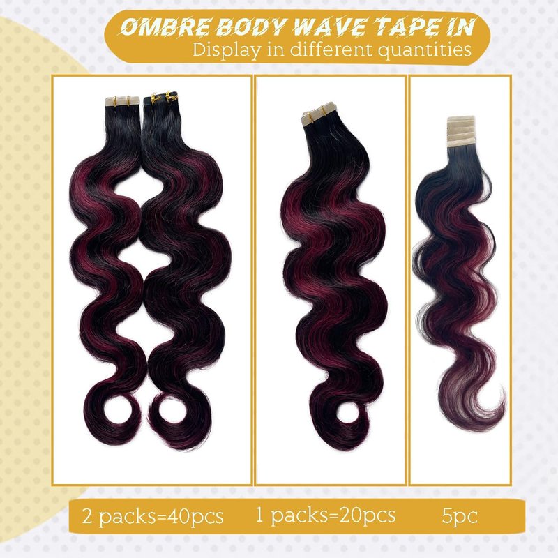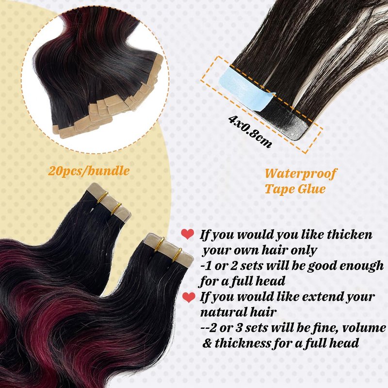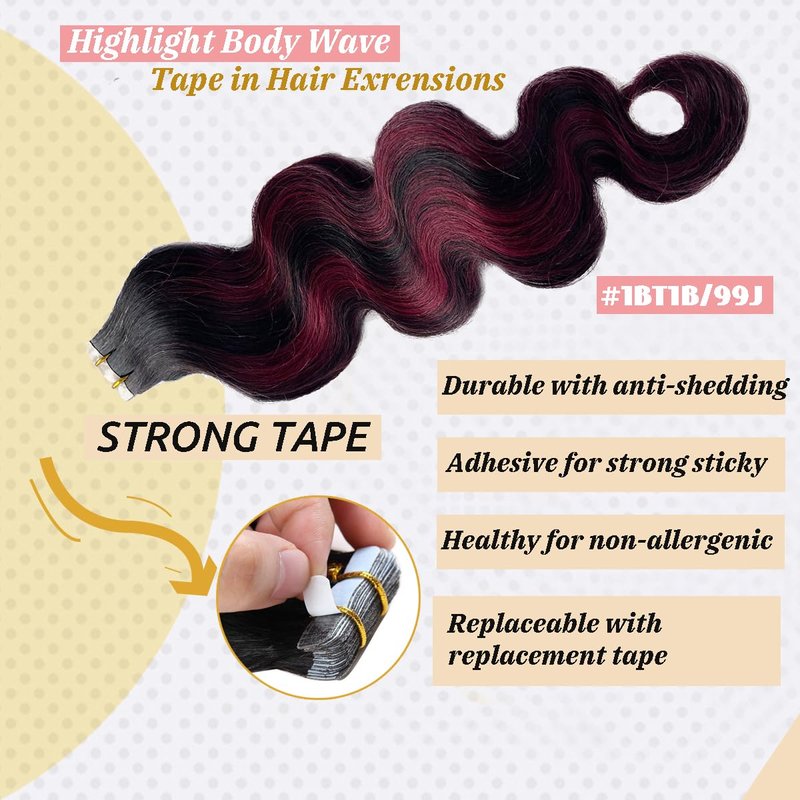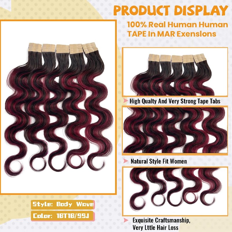 Burgundy Body Wave Tape in Human Hair Extensions Highlight Natural Black to Burgundy Hair Extensions 100% Real Human Hair Double Sided Tape in Ombre Human Hair Tape in Extensions 16 Inch #1B/99J