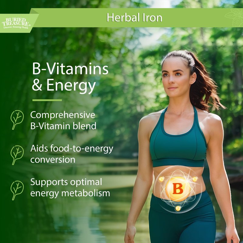- Buried Treasure Herbal Iron is not only rich in iron but contains Vitamin B6, Vitamin B12, and also Thiamin (B-1), Riboflavin (B-2). Super foods baobab, nopal, organic spinach and fennel.