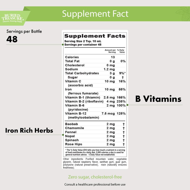 Buried Treasure Herbal Iron - 48 Servings, Liquid Iron and Herbal Supplement, Vitamin C & B Complex Vitamins, Iron-rich Greens, Vegan Iron for Men and Women
