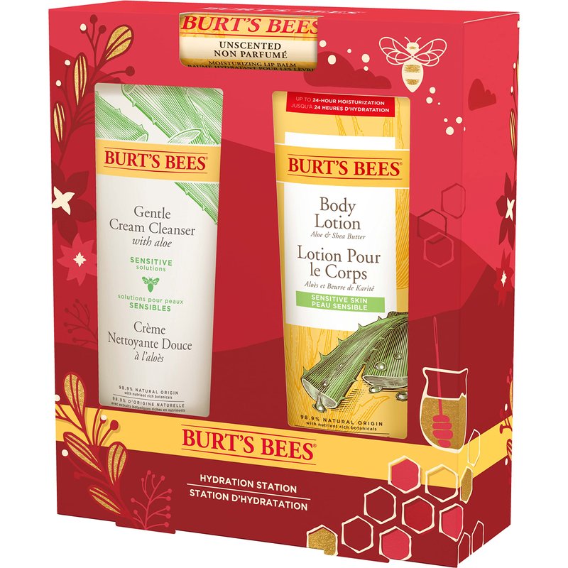 - SMALL PACKAGE CONTENT: One package of Burt's Bees Hydration Station Gift Set includes unscented lip balm, gentle cream cleanser and healing body lotion for sensitive skin with holiday-themed packaging