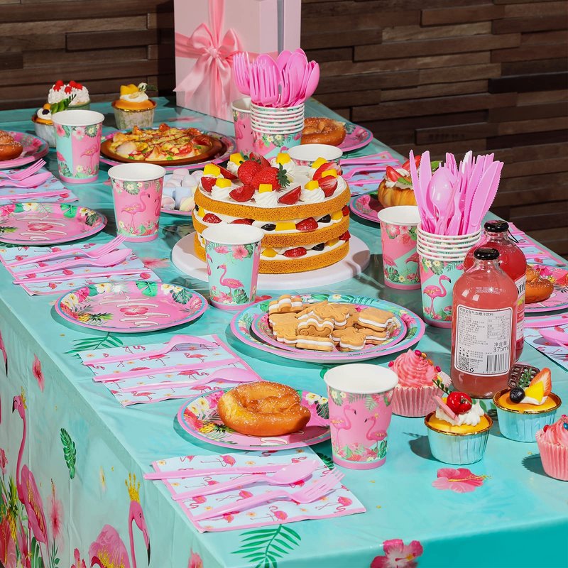 - Flamingo Aloha Birthday Party Supplies: there are 179 pieces flamingo birthday party decorations and tableware which can serve for 24 guests; They are 1 pink happy birthday banner, 2 flamingo party tablecloths, 8 tropical Hawaiian hanging swirls, 24 pcs 9" dinner plates, 24 pcs 7" dessert plates, 24 pieces 9 oz disposable cups, 24 disposable paper napkins and 24 sets of plastic forks, spoons and knives