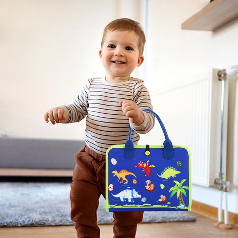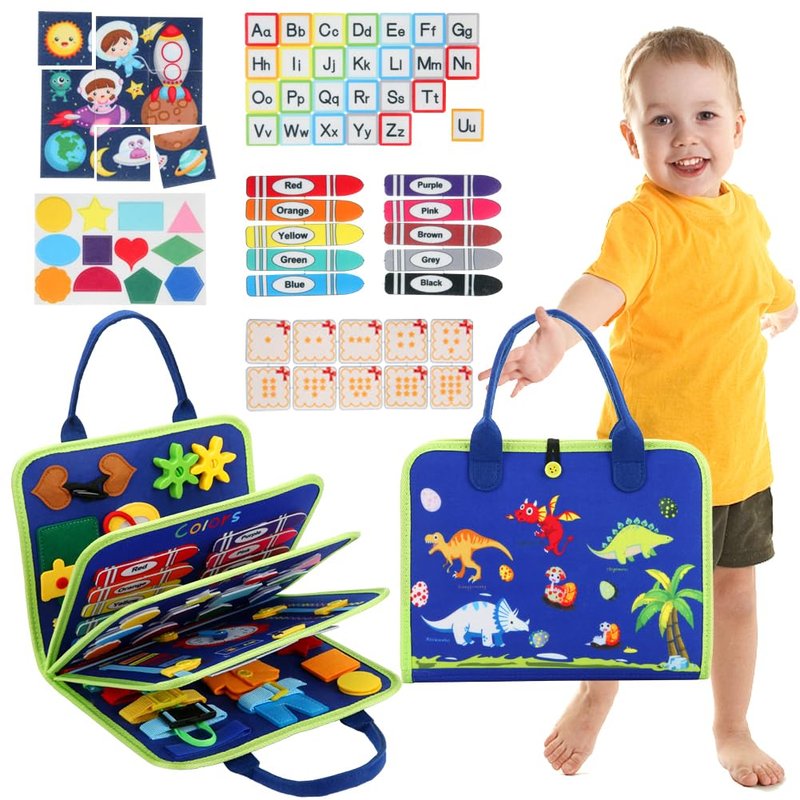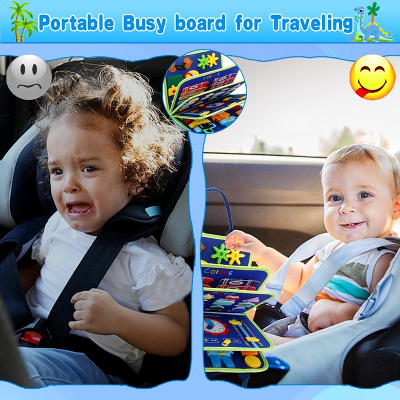 - Portable Montessori Travel Toys- This sensory toy busy board comes with a carrying handle for easy portability and an interior zippered pocket to keep small parts neatly organized to avoid losing them. It will keep kids entertained whether they're on a plane, on a road trip, or in the car or train.