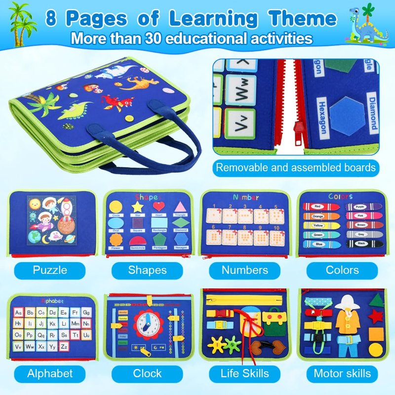 - Busy Board for Toddlers- This busy board montessori toy has 8 pages with over 30 learning activities to develop fine motor skills, and the flexible zipper can be divided into 4 busy books for multiple children to play at the same time. In addition, there are dinosaurs and cute letters on the front and back cover, and extra 5 packs of detachable sorting and matching DIY materials (puzzles, numbers, letters, colors, shapes) for toddlers to to use their imagination and hands-on skills!