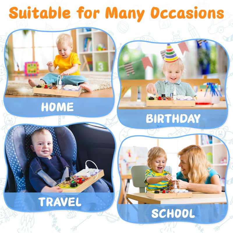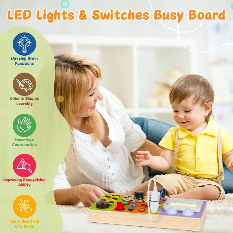 - Montessori Busy Board with LED Light: Is your little boy/girl loves buttons, switches, and lights?Chillife busy board is specially designed for toddlers who love switches buttons and LED lights,the montessori busy board features 19 lights, various switch buttons, and plug, and also we designed a master switch to control all lights, even a one-year-old can easily manipulate all the switches and knobs on this toddler busy board !