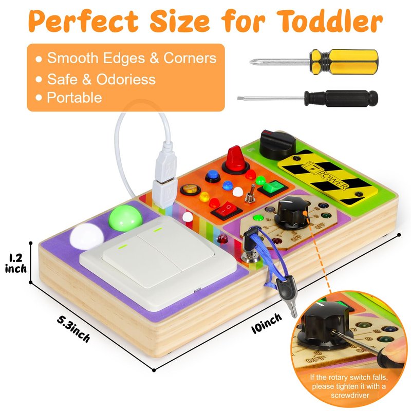 - Safe & Sturdy Wooden Toys: The busy boards toys are made of natural wood,carefully handmade with smooth corners and edges, all the various buttons/switches/shifters are solidly installed and ensure your child safe during use. Pass the US toy standard CPSIA & ASTM test. A baby sensory board and small screwdriver is include in package, baby busy board requires 2 AAA batteries (not included).
