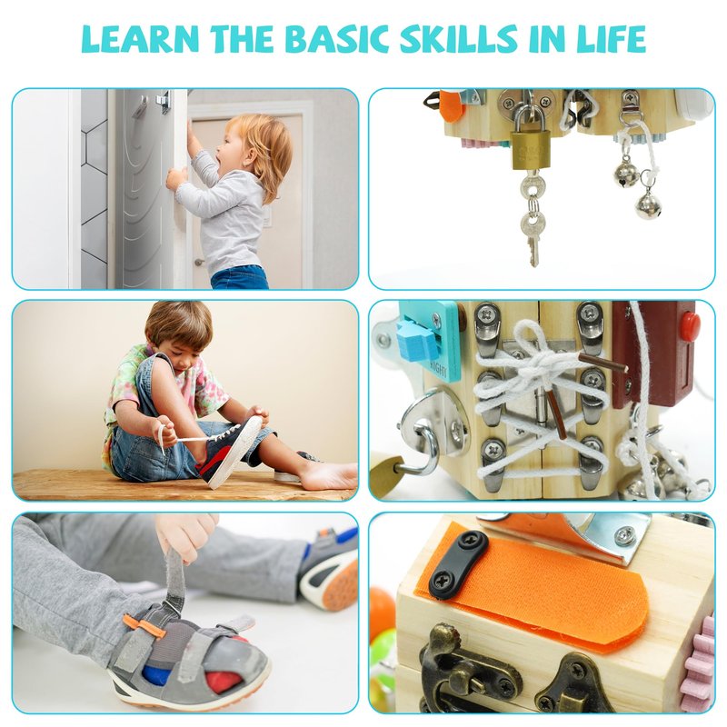 - 🌀15-in-1 Montessori Toy - This quality wooden interactive toy includes ffishing worm,beads,move the car,unlock,tie shoelaces,spring bolt, bell,switch,hook lock,buckle lock,hook and loop,pulley,gear,animal stickers,mirror. Cultivate children's cognitive, attention and learning ability.