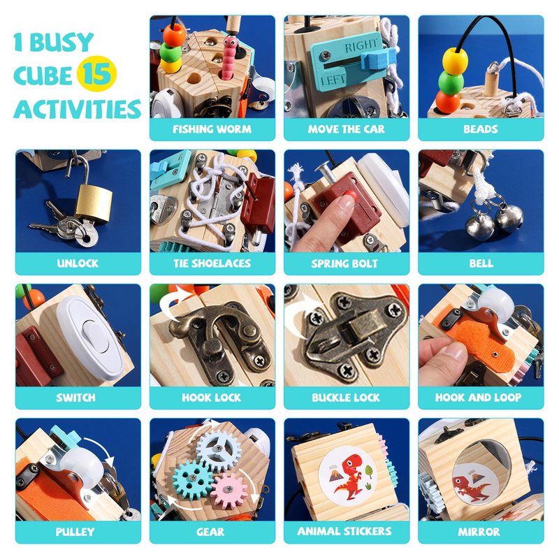 Busy Cube for Kids 15-in-1 Sensory Busy Board Travel Toy Handmade Montessori Educational Learning Toys Activity Board Wooden Activity Cubes for Toddlers 1 2 3 4 5 Years Old